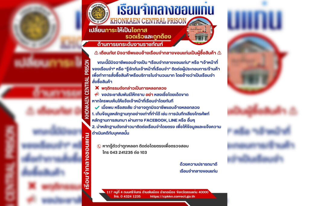 เตือนภัย! มิจฉาชีพแอบอ้างเรือนจำกลางขอนแก่นเป็นผู้ซื้อสินค้า … อ่านต่อ